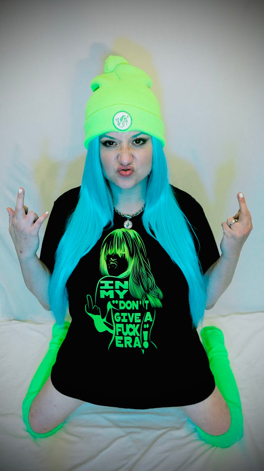"In My Don't Give a Fuck Era" Unisex t-shirt in Black Heather with lime green print
