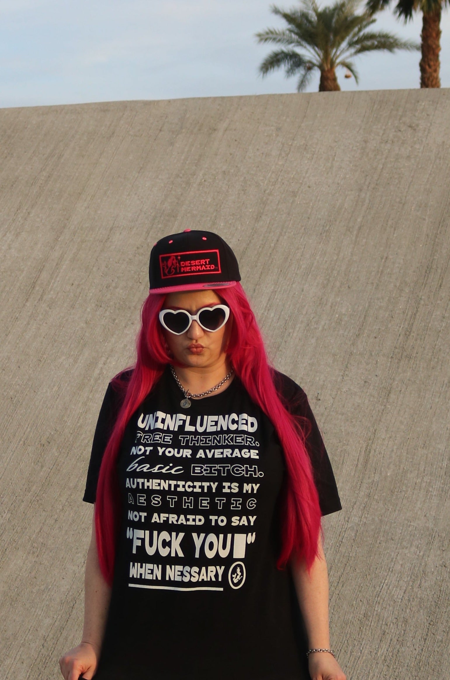 The Desert Mermaid Black and Pink Snapback hat is structured with a classic fit, flat brim, and full buckram. The adjustable snap closure makes it a comfortable, one-size-fits-most hat.